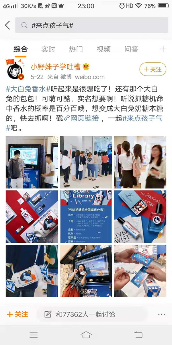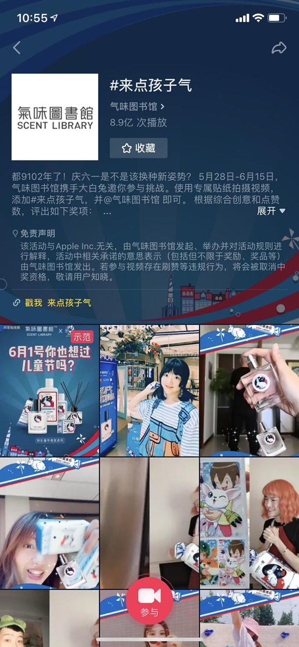 “抖音”作为当下最火爆的短视频平台之一,是许多品牌都跃跃欲试的推广领域,但实际上并非每个品牌都能结出甜美的营销果实。索象为气味图书馆开启“来点孩子气”为主题的抖音挑战赛,共吸引8.8亿人次播放量,更吸引了腾格尔、网红阿纯、多余和毛毛姐等参与互动。建立的微博话题#大白兔香水#,单日热度破2.5亿,各路明星加码转发,引发声势。此次活动中,索象还跨界时间节点选择在六一前夕开始进行,不仅唤起了众多国人的的儿时记忆,也引起了多方关注和讨论。
